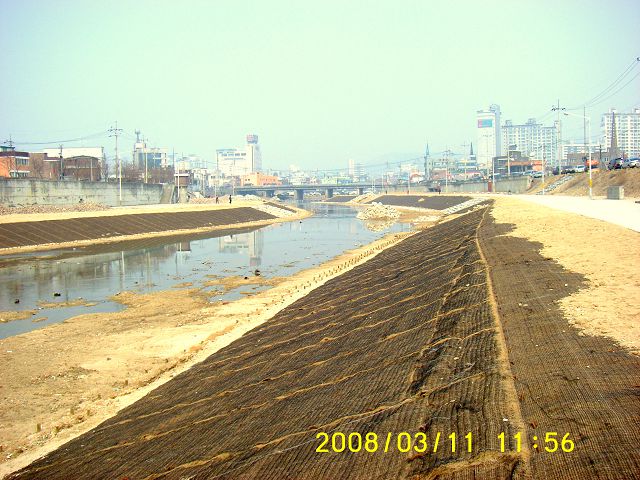 입체파워매트 설치와 아울러 수충하단부에 침방 코이어롤을 한줄로 설치중